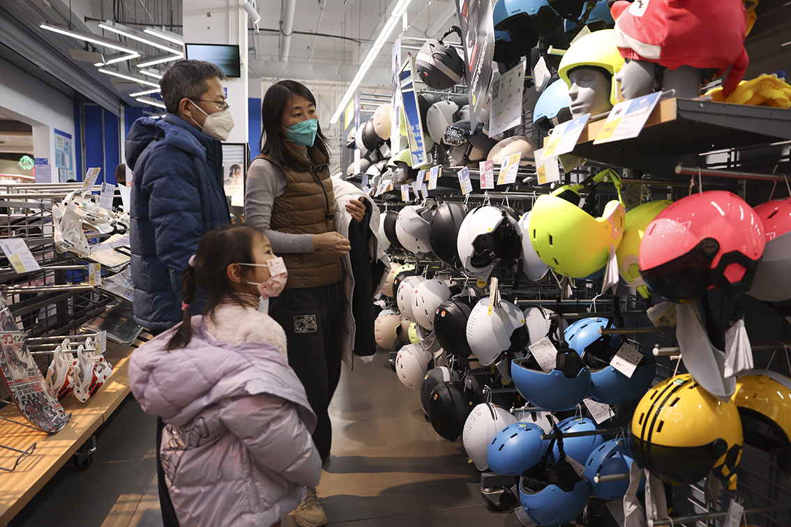 1月2日,市民在北京荟聚中心选购滑雪头盔。(图片来源:中新社)