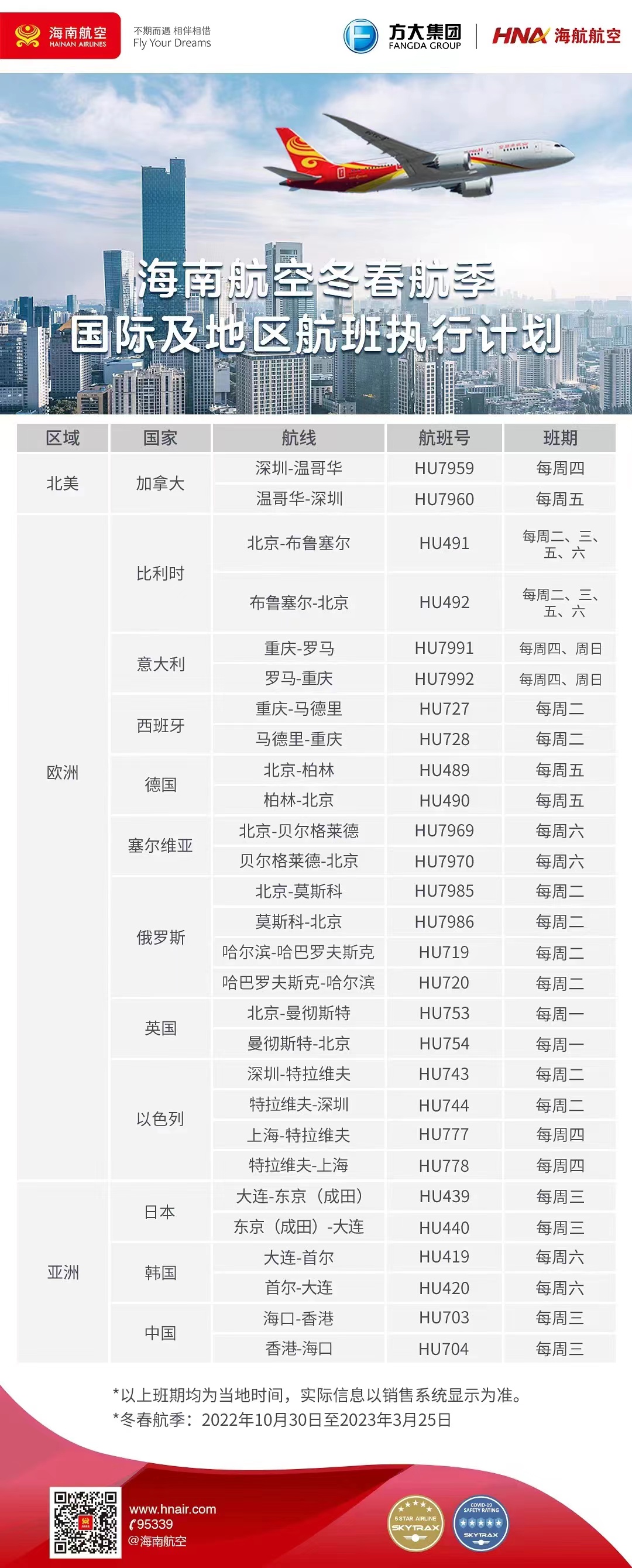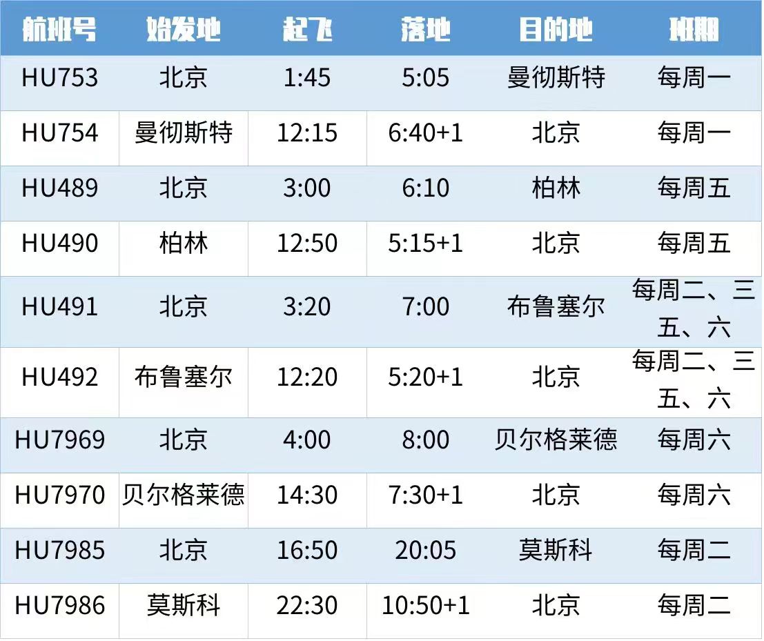 图为海南航空国际航班时刻表。(图片来源:海航官方公众号)