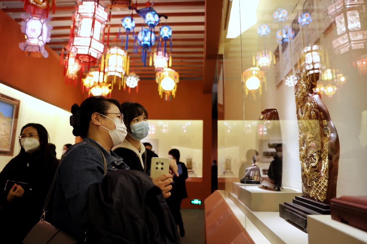 1月8日,观众欣赏清代金漆木雕人物龙纹桌灯。(图片来源:中国日报网)