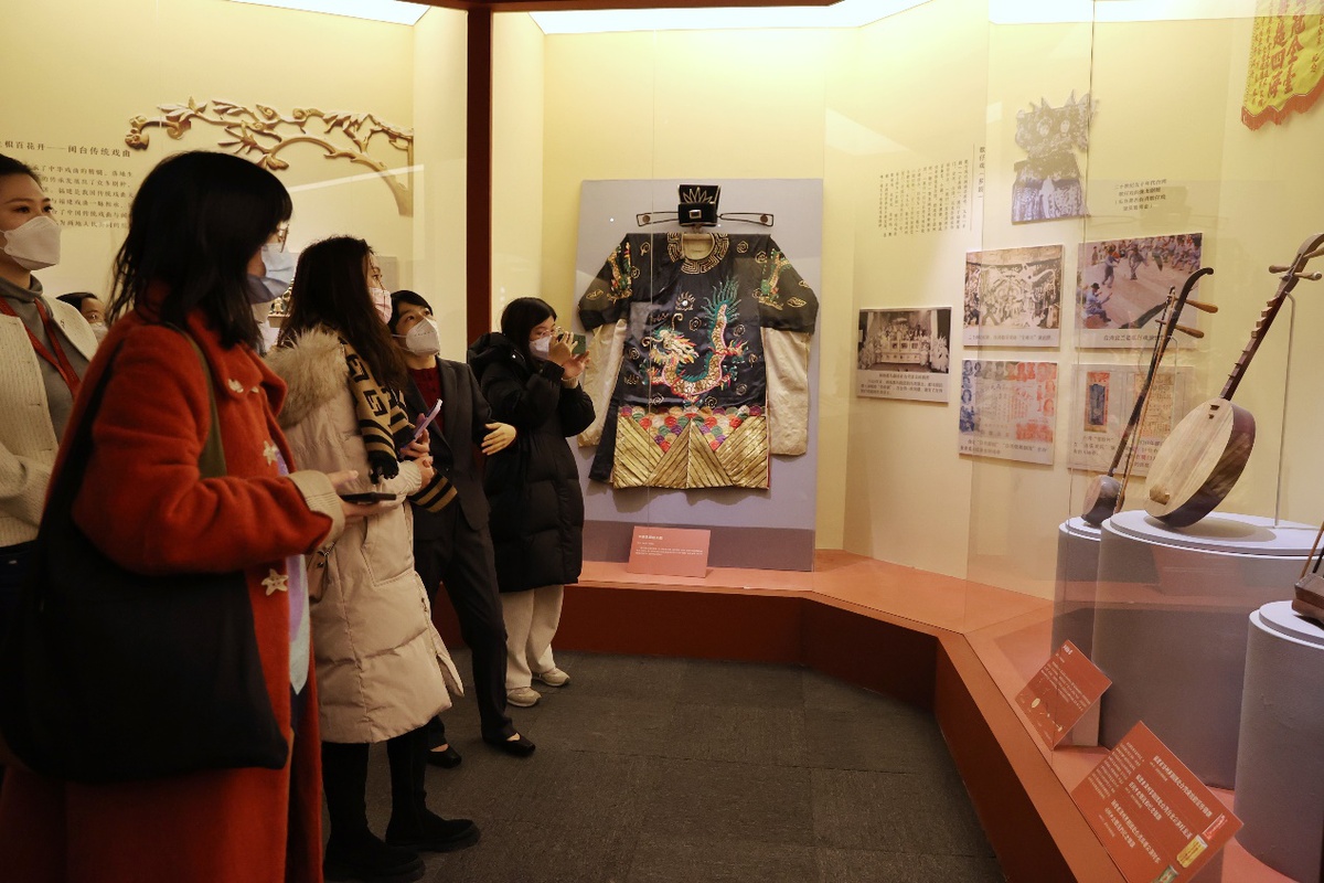 1月8日,观众观看展出的戏曲服饰及乐器。(图片来源:中国日报网)