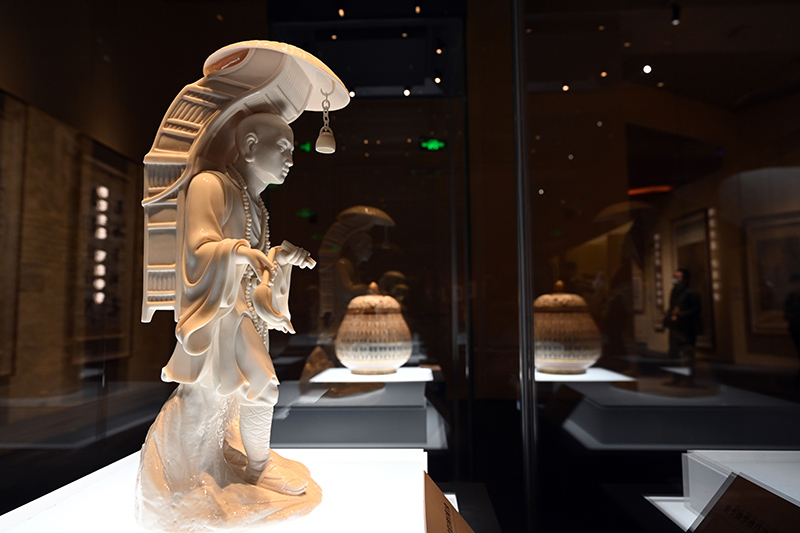 展出的德化白釉玄奘立像(1月8日摄)。(图片来源:新华社)