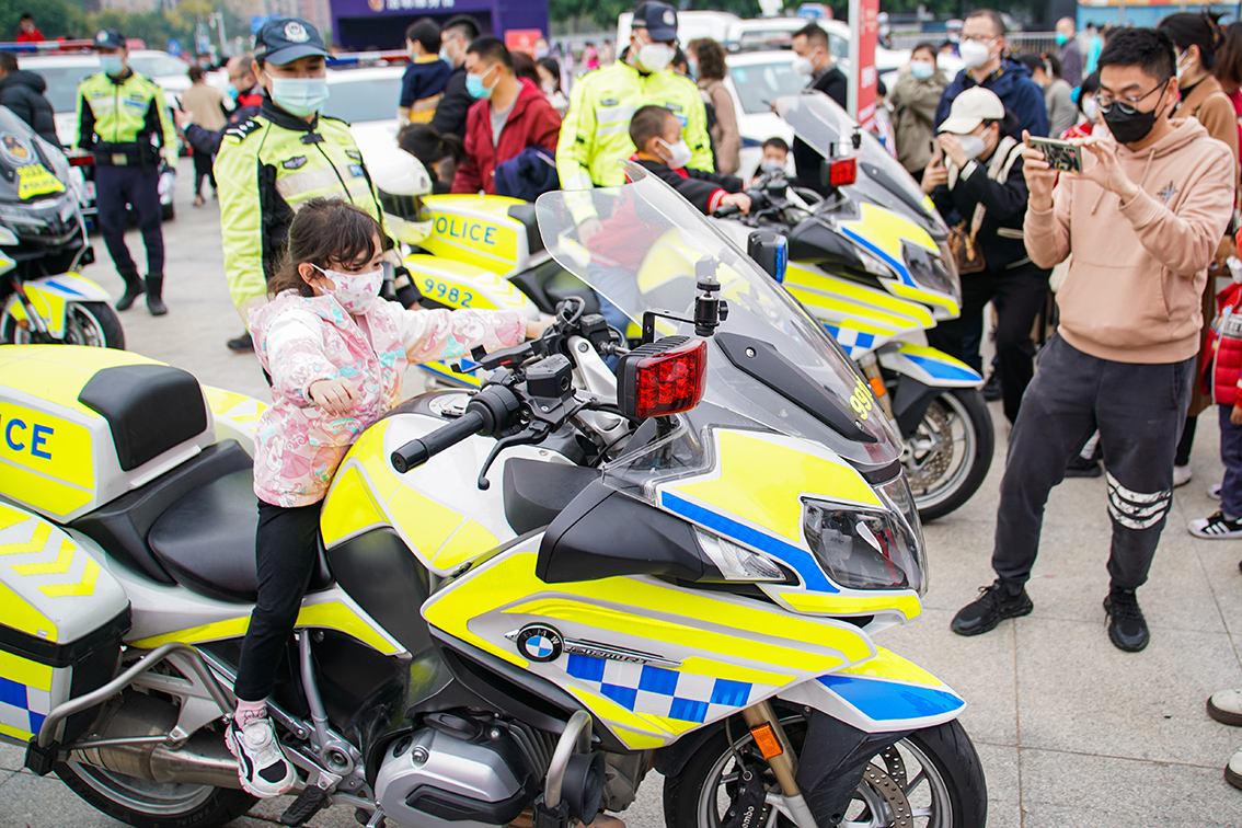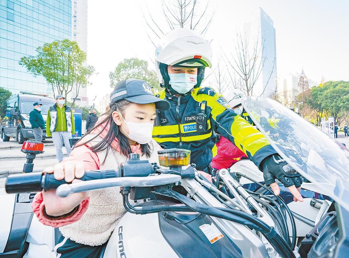 1月8日,武汉市公安局在西北湖广场隆重举行主题为“平安武汉共同缔造”警营开放日活动。当天,小朋友体验汉警快骑的警用大排量摩托车。(图片来源:《湖北日报》)