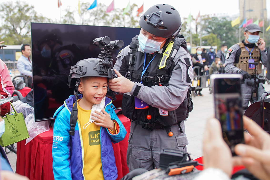 1月8日,武汉市公安局举行“平安武汉共同缔造”警营开放日活动,各种新奇特、“尖板眼”的警用装备和互动项目,吸引了大批市民现场观摩、体验。图为民警与参加活动的小朋友互动。(图片来源:人民网)