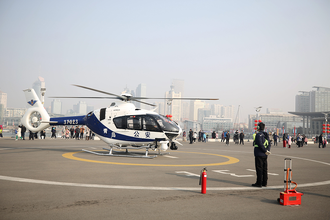 1月8日,青岛公安警用直升机吸引市民现场围观。
