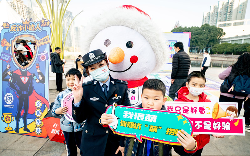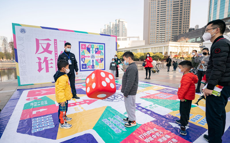 1月8日,武汉市公安局举行“平安武汉共同缔造”警营开放日活动,小朋友在游戏中学习反诈知识。(图片来源:人民网)