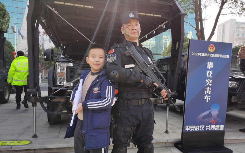 1月8日,武汉市公安局举行“平安武汉共同缔造”警营开放日活动,小朋友与特警合影。(图片来源:人民网)
