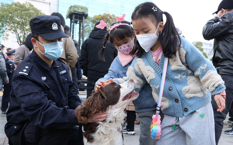 1月8日,武汉市公安局举行“平安武汉共同缔造”警营开放日活动,小朋友与警犬零距离接触。(图片来源:人民网)