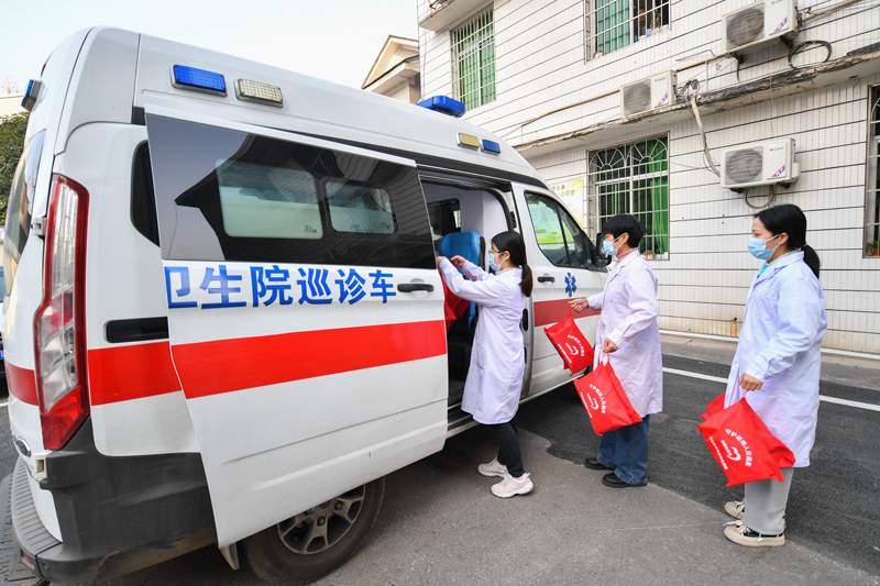 近日,湖南省湘潭市雨湖区在前期发放4000份防疫健康包的基础上,再次购入6000份防疫健康包,重点发放给农村地区65岁以上老年人及困难人群。同时,雨湖区家庭医生团队还为群众提供血氧饱和度检测、血压检测、用药指导、基本医疗、防疫知识科普等服务。图为1月7日,在湖南省湘潭市雨湖区,医护人员将防疫健康包运送到巡诊车上。(图片来源:新华社)