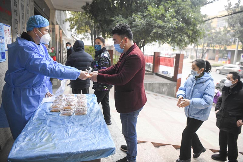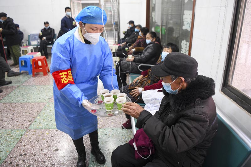 1月5日,湖南长沙县江背镇中心卫生院的医护人员向当地居民免费提供新冠防治中药,并为居家老人送药下乡。(图片来源:中新社)