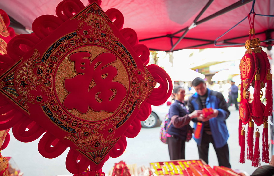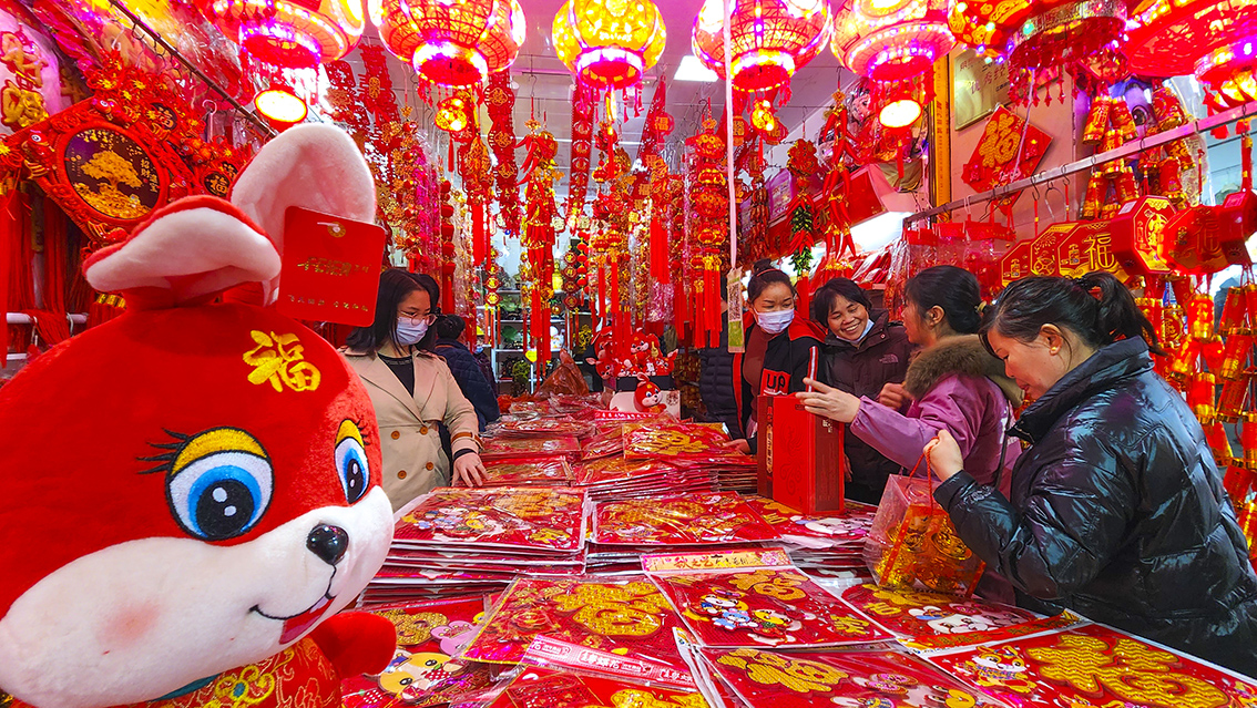 1月11日,在湖南省常宁市宜阳街道农贸市场,人们在挑选春节饰品。