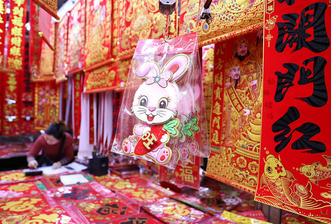 这是辽宁沈阳五爱国际小商品城一家店铺展售的春节饰品(1月11日摄)。