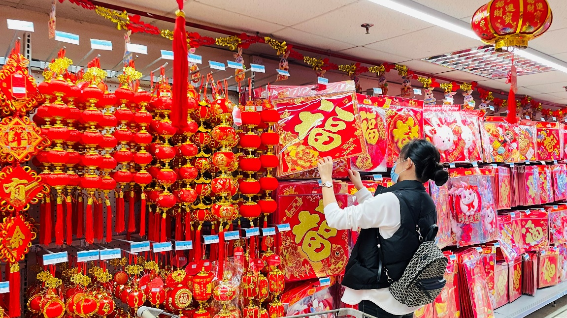 2023年1月12日,沃尔玛中国大卖场进入春节销售高峰期,全国几百家门店不断迎来客流新峰值。图为顾客在精心挑选节庆用品,年味浓郁。(图片来源:中国日报网)
