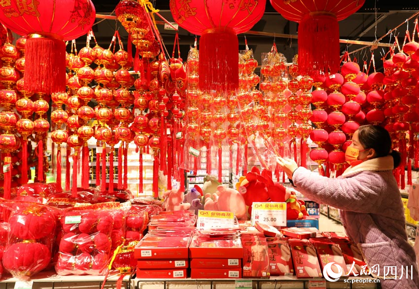 春节将至,四川省眉山市仁寿县的文化年货市场日渐红火。市民纷纷选购、置办红灯笼、春联、福字等,各种新春文化年货俏销。大街小巷挂满了新春装饰品,古城春意扑面而来。(图片来源:人民网)