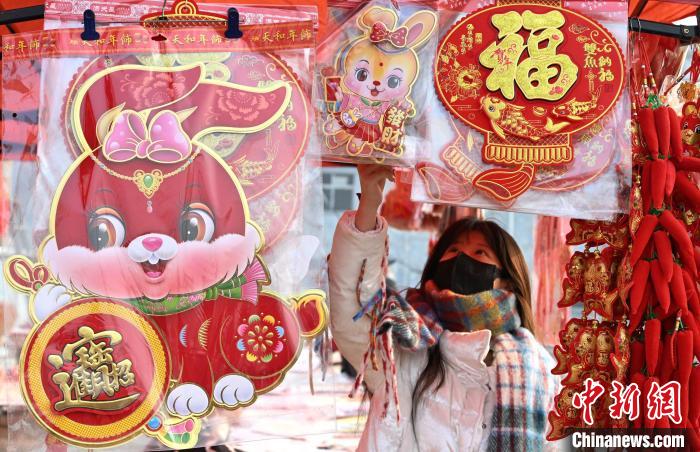2023年1月12日,市民在江苏省连云港市连云区一家年货市场选购春节饰品。(图片来源:中新社)