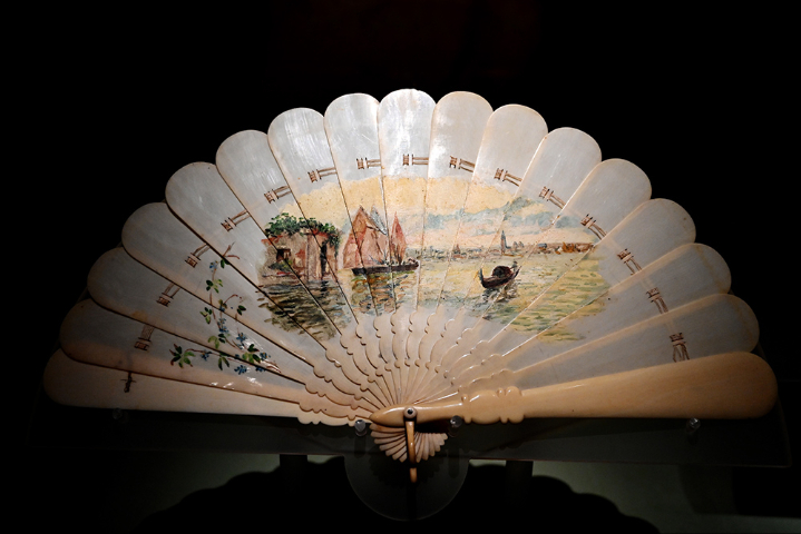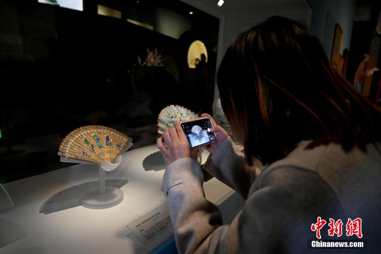 展览展出的19世纪欧洲港湾风景图象牙折扇。(图片来源:中新社)