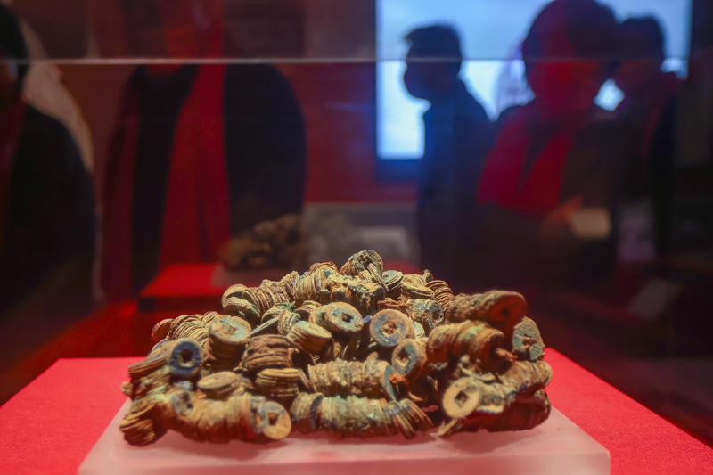 展厅内展陈的西汉时期四铢半两钱。(图片来源:中新社)