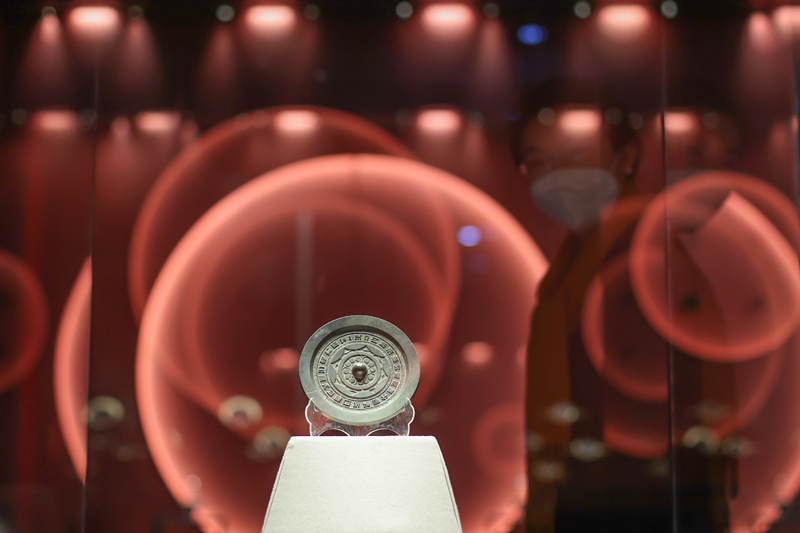 观众在展厅内参观展陈的吕氏铭环绕式神兽铜镜。(图片来源:中新社)