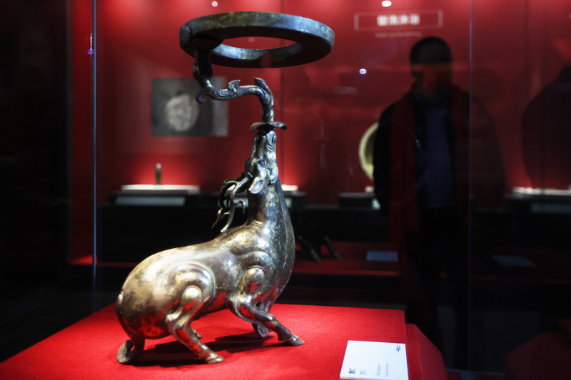 展厅内展陈的西汉时期鎏金铜鹿灯。(图片来源:中新社)