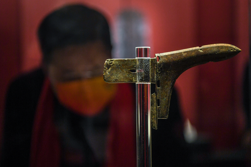1月12日,观众在大云山汉王陵博物馆参观西汉“鎏金铜戈”。(图片来源:新华社)