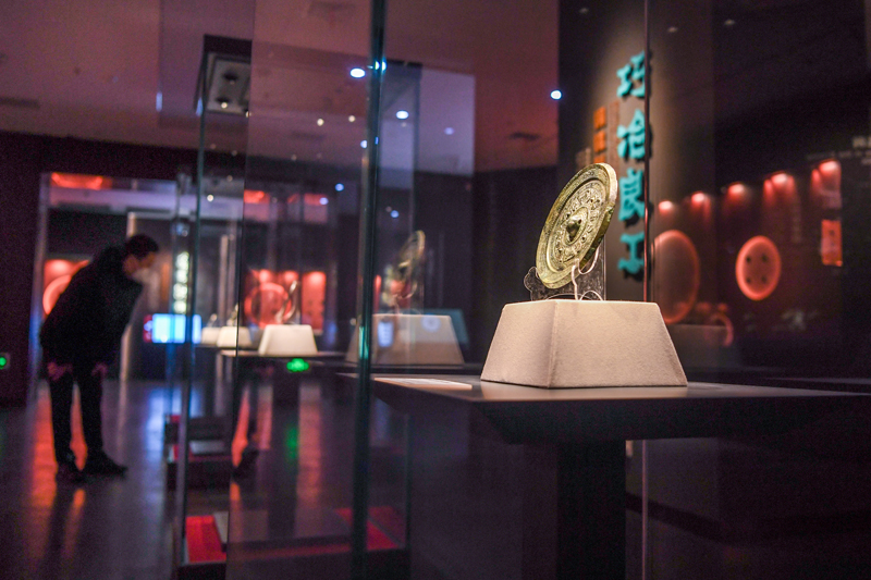 1月12日,观众在大云山汉王陵博物馆铜镜展区内参观。(图片来源:新华社)