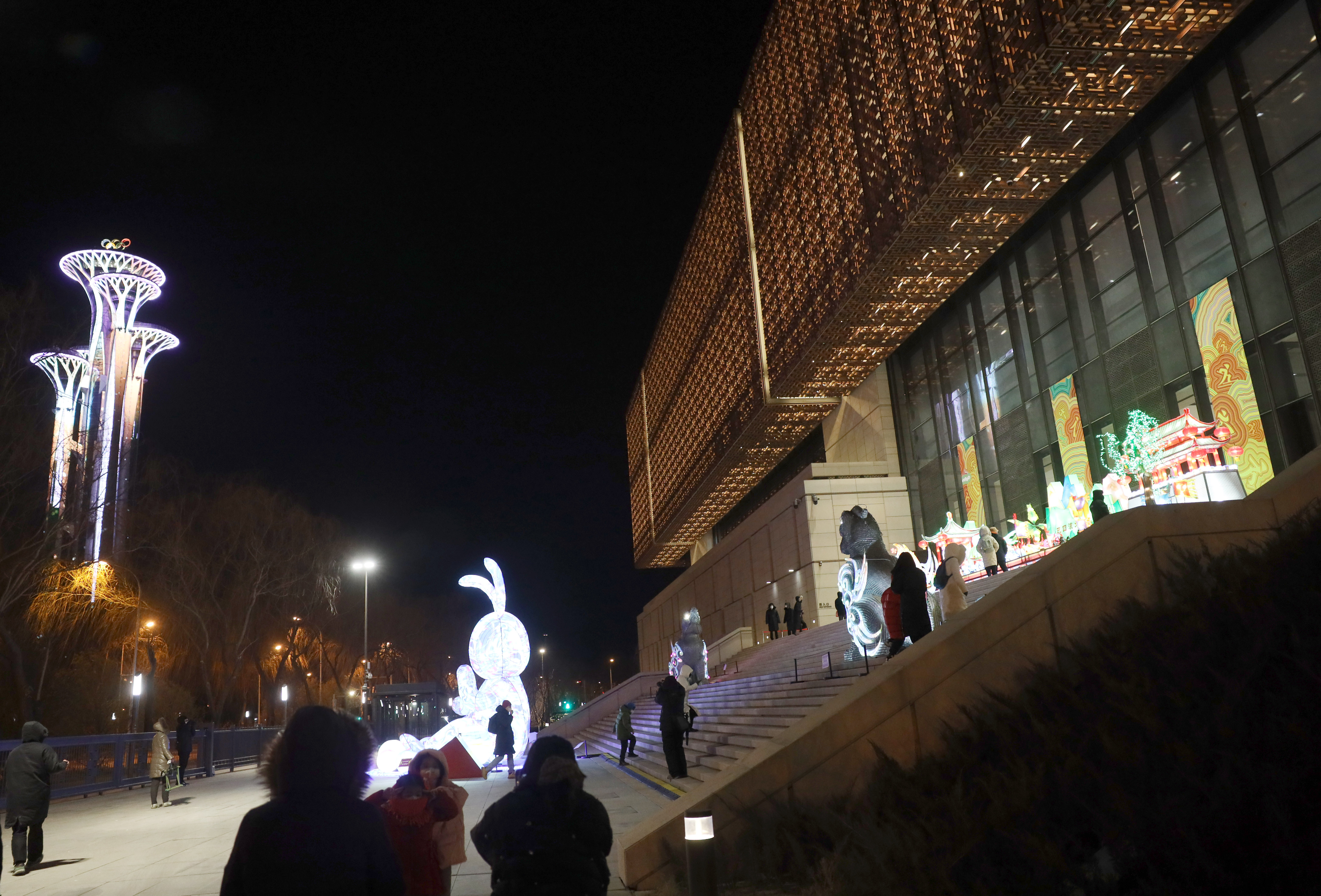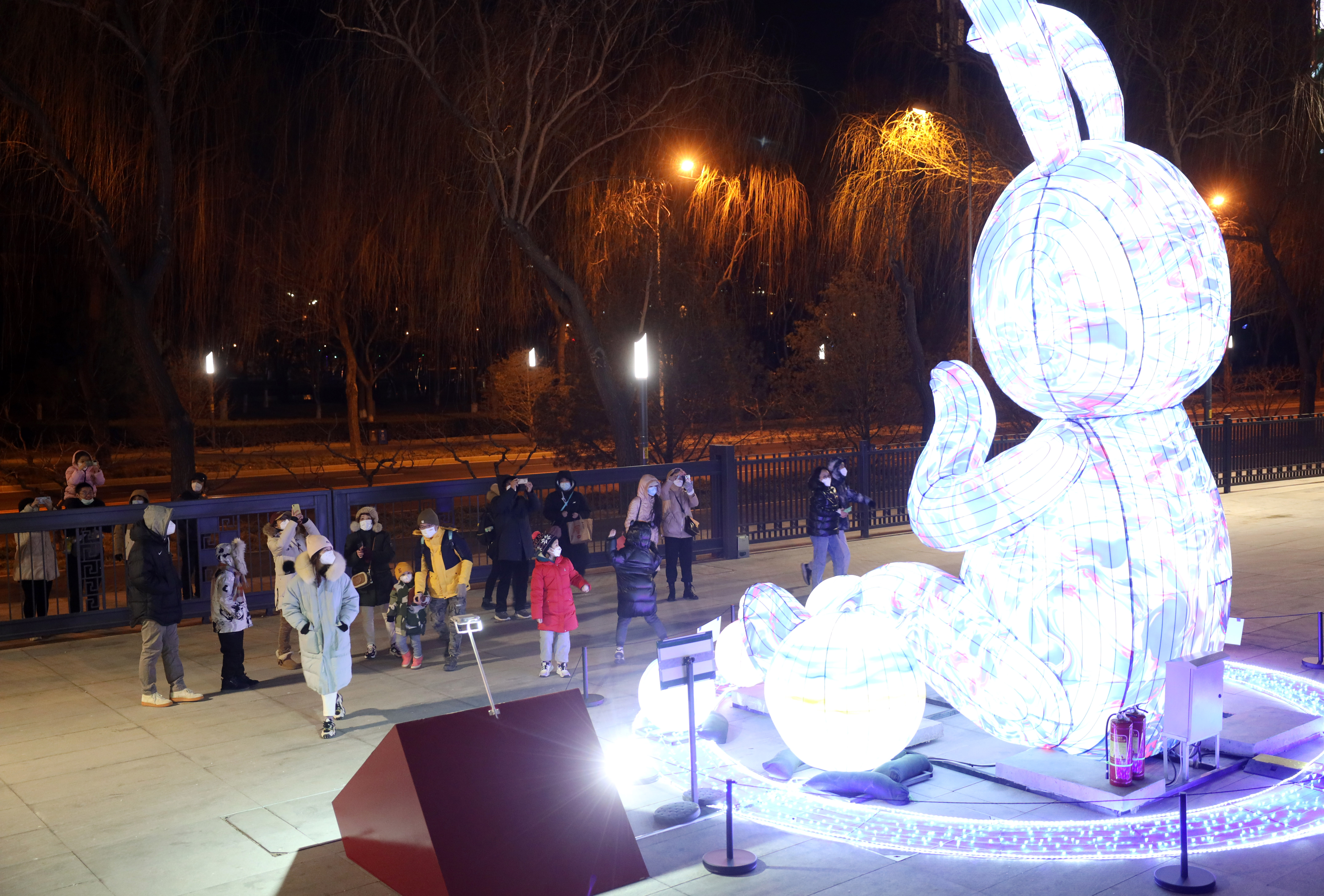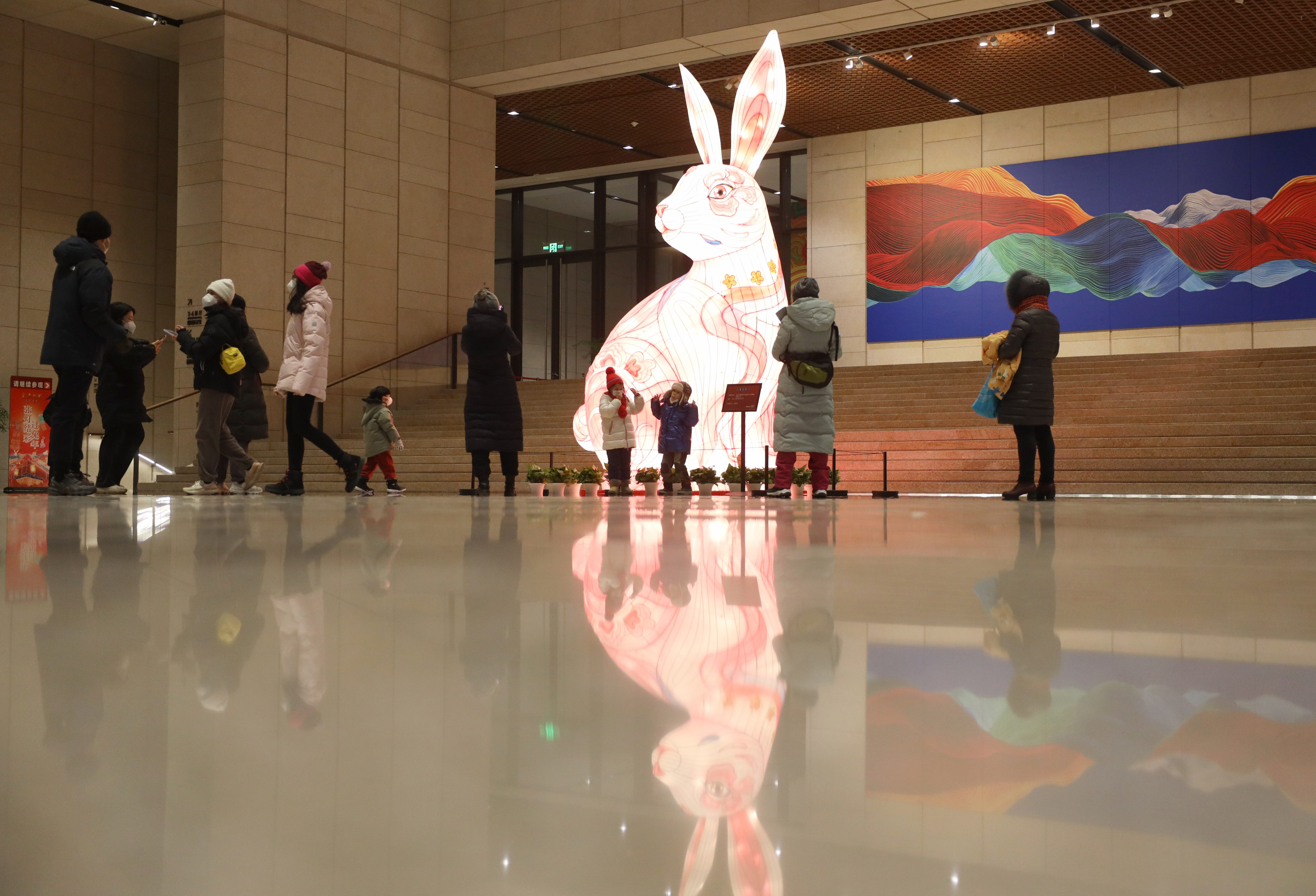 2023年1月14日,观众在中国非物质文化遗产馆内观赏自贡灯彩“兔吉祥”。
