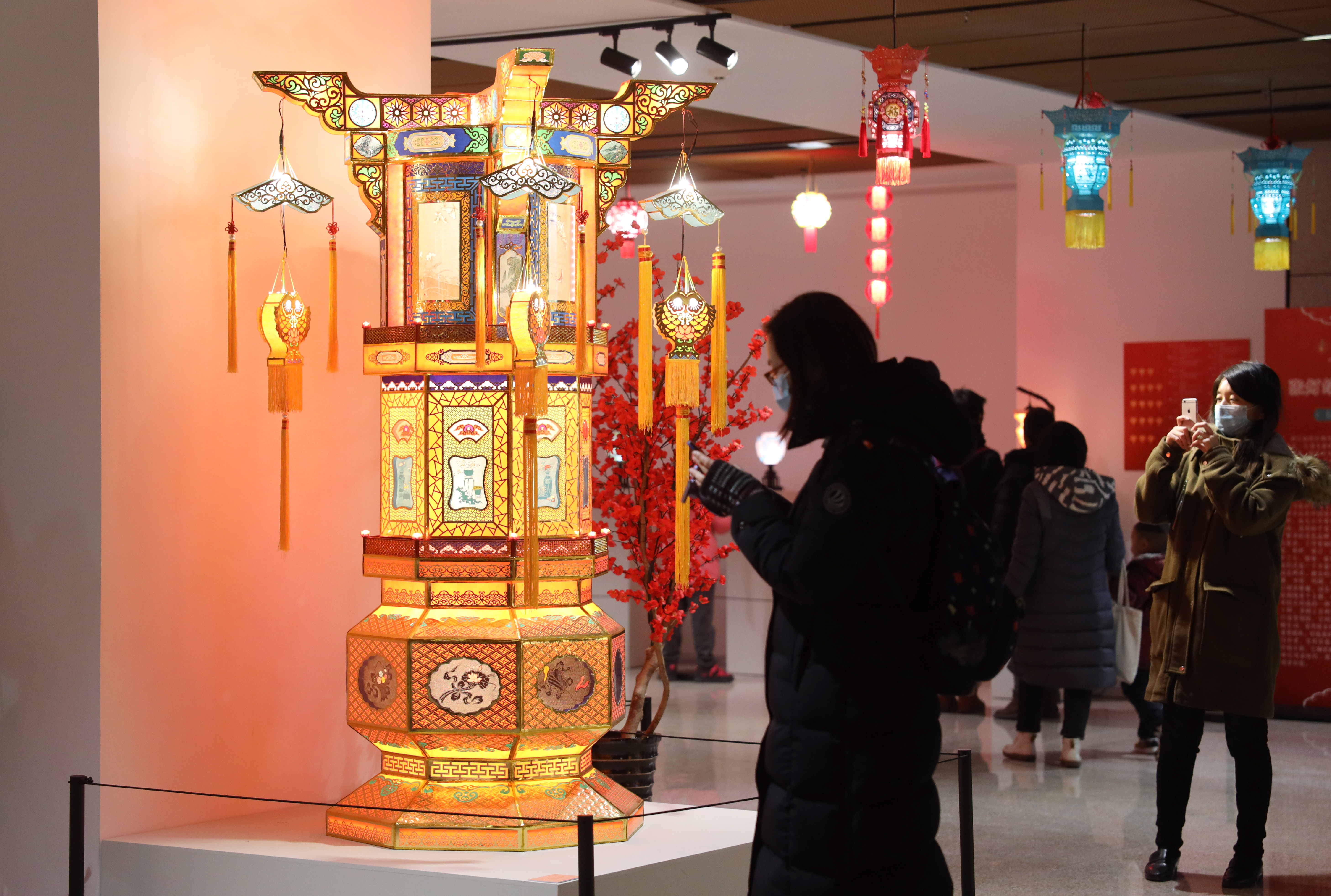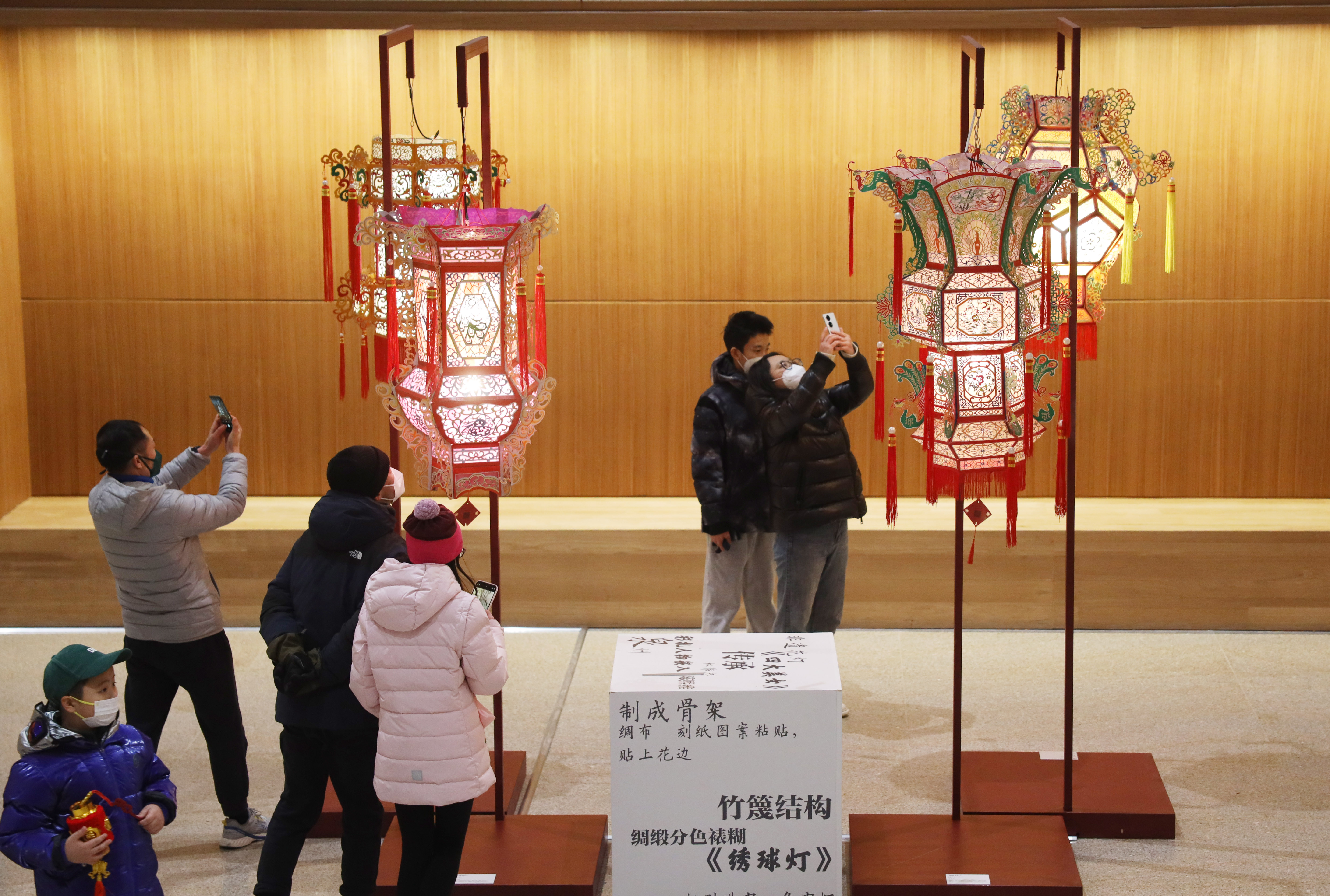 2023年1月14日,观众在中国非物质文化遗产馆内欣赏硖石灯彩。据了解,硖石灯彩,始于唐盛于宋,至今已有1200多年历史。硖石灯彩制作精细、构思奇妙,融诗词、书法、绘画、篆刻、金石、刺绣等艺术元素于一体,其制作工艺精细独特,蜚声海内外。