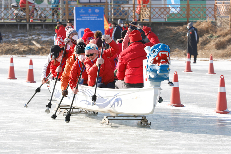 1月15日,宁夏银川,市民参加冰上龙舟比赛,迎接即将到来的新春佳节。当天,2023年银川市第三届冰上龙舟比赛正式开赛,来自宁夏的23支代表队共200余名健身爱好者参加。(图片来源:中新社)
