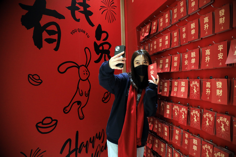 1月15日,上海市民与新年幸运签合影。随着中国农历新年的临近,上海的商场、街头处处洋溢着红红火火的喜庆氛围,吸引了不少民众前来感受年味。(图片来源:中新社)