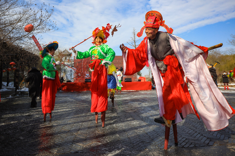 1月15日,江苏洪泽湖畔老子山镇龟山村的男女老少聚集在一起,延续“记住乡愁 留住年味”主题,烧大锅菜、舞龙巡村、踩高跷、新年祈福、吃团圆宴……拉开了村民过大年的序幕。龟山村因地形似巨龟浮于水面而得名,这里自然环境优美,民风淳朴,保留了村落的历史格局与传统风貌,并于2014年入选第三批中国传统村落名录。图为村民表演踩高跷。(图片来源:中新社)