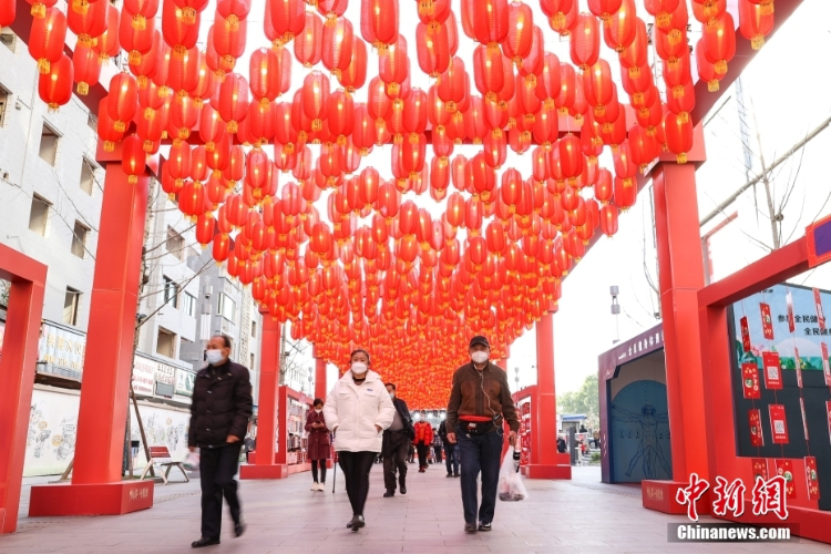 贵阳市南明区青云路举行的2023百姓新春年货节吸引民众前来游玩、购置年货。长长的走廊上挂满了红灯笼,一抬头,满眼喜气。(图片来源:中新网)