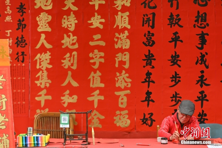 广东省佛山市,书法爱好者在“挥春街”为市民写挥春。挥春也作春联、门联、福贴,粤语地区称挥春,佛山市的快子路是当地有名的“挥春街”,随着农历新年的临近,书法爱好者毛笔书写的挥春吸引不少市民前来挑选。(图片来源:中新网)
