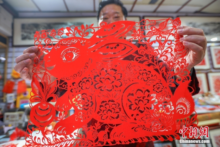 南京市工艺美术大师、非遗剪纸传承人陈耀在其工作室展示他创作的兔年剪纸作品,迎接新春佳节的到来。(图片来源:中新网)