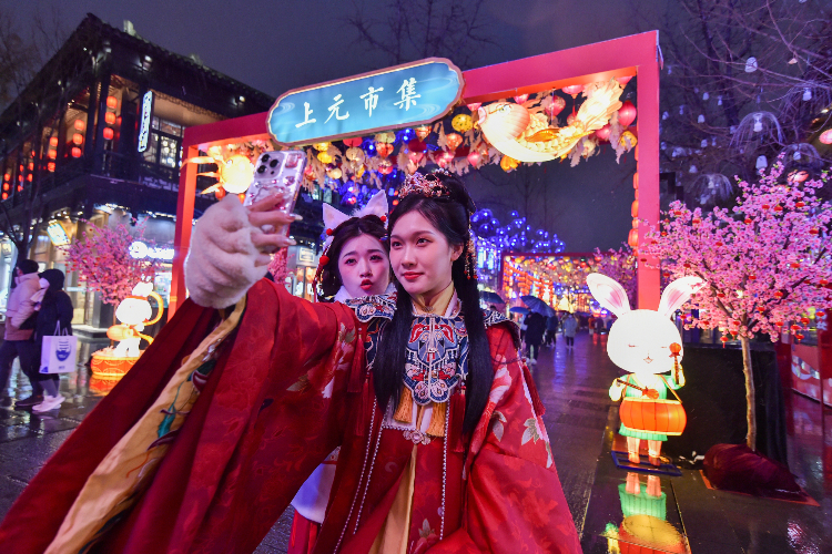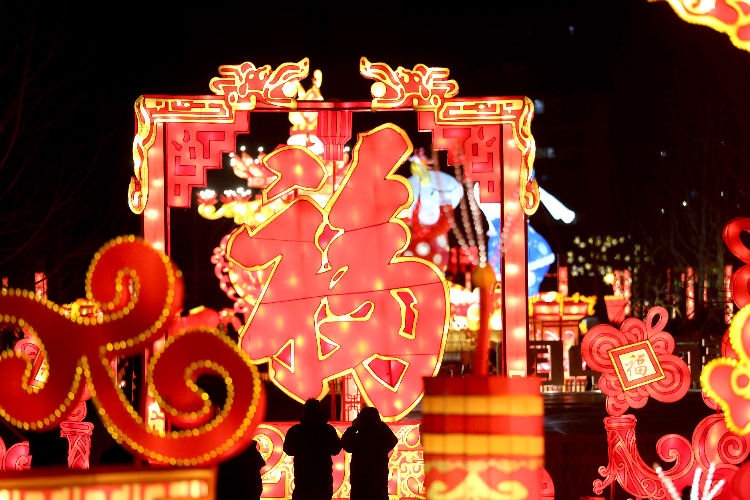 1月15日,游客在沈阳故宫门前广场赏灯留影。兔年春节临近,二十余组花灯亮相辽宁省沈阳市古城的核心区域,吸引了许多市民和游客来此感受节庆气氛。(图片来源:新华社)