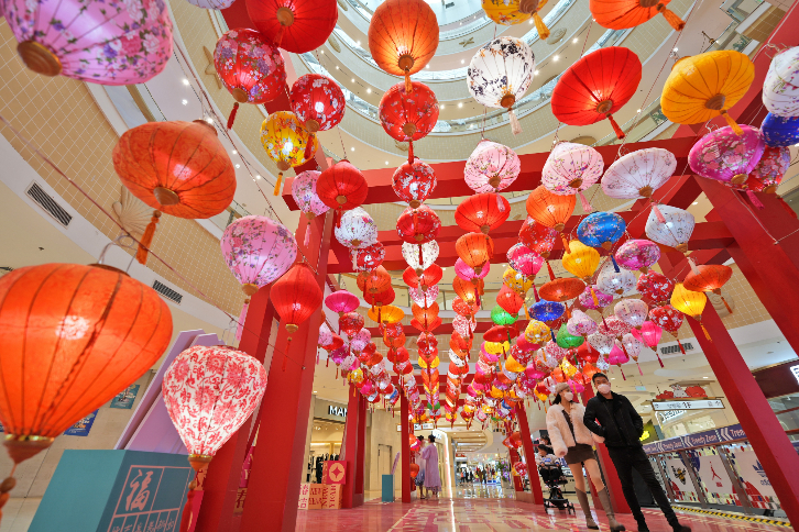 1月14日,人们在山东烟台一家商场观赏花灯。新春将至,大江南北洋溢着喜庆的节日氛围。(图片来源:新华社)
