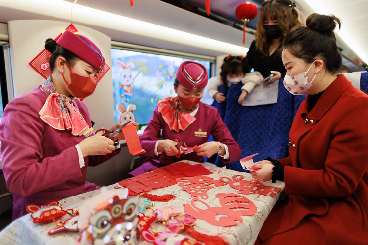 1月13日,C5980次列车乘务员在和旅客一起剪纸。当日,在贵阳北开往成都南的C5980次复兴号高铁列车上,乘务员们热情邀请旅客们参与剪窗花、贴年画、做年糕、画糖画等活动。浓浓的新春喜庆气氛在车厢内洋溢,大家在欢声笑语中一起迎接即将到来的小年。(图片来源:新华社)