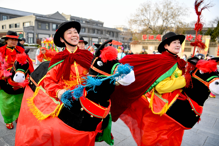 1月15日,民间艺人在亳州市谯城区华佗广场进行民俗表演。春节临近,安徽省亳州市举办民俗表演迎新春活动,民间艺人表演舞龙、斗驴、抬花轿、扭秧歌等民俗节目,迎接新春佳节的到来。(图片来源:新华社)