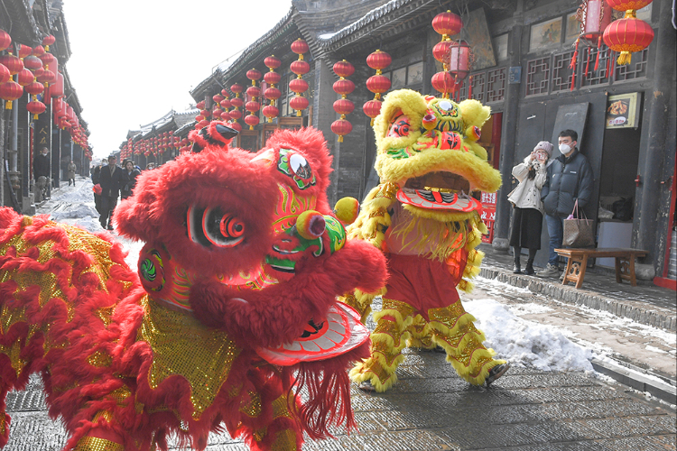 1月14日,民间艺人在山西平遥古城内表演舞狮。当日是农历小年,各地张灯结彩,人们开始采购年货,年味渐浓。(图片来源:新华社)