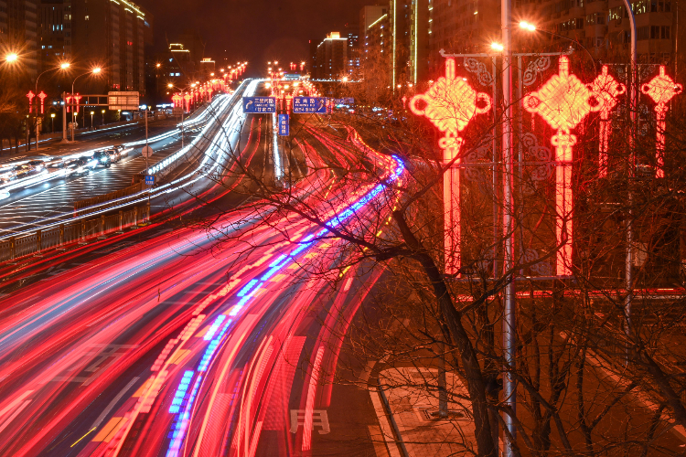 1月14日,北京木樨地桥和复兴门外大街两侧的“中国结”灯饰。随着春节临近,北京长安街等街道两侧点亮灯饰,年味渐浓。(图片来源:新华社)