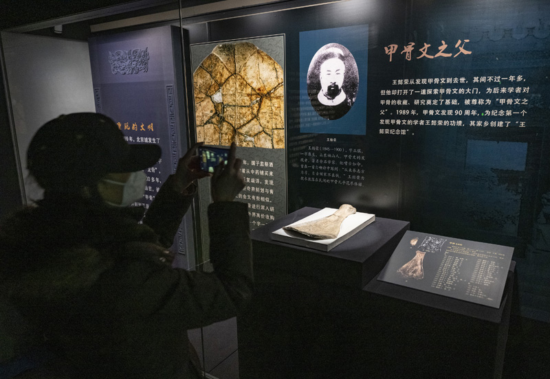 1月17日,“殷墟甲骨”展区内一位观众参观“甲骨文之父”王懿荣的介绍。(图片来源:中新社)