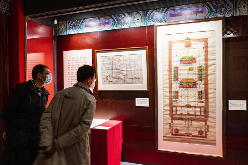 “明清档案”展区内展示的“样式雷”《大高殿内坍塌修补图样》(右)等展品吸引观众查看。(图片来源:中新社)