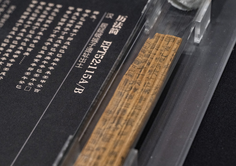 “居延汉简”展区中展示的一条“历法简”的真迹实物展品。(图片来源:中新社)