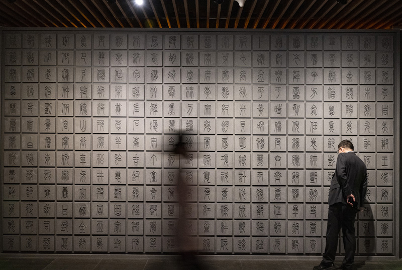 “居延汉简”展区内的汉简字形“百家姓”展墙。(图片来源:中新社)