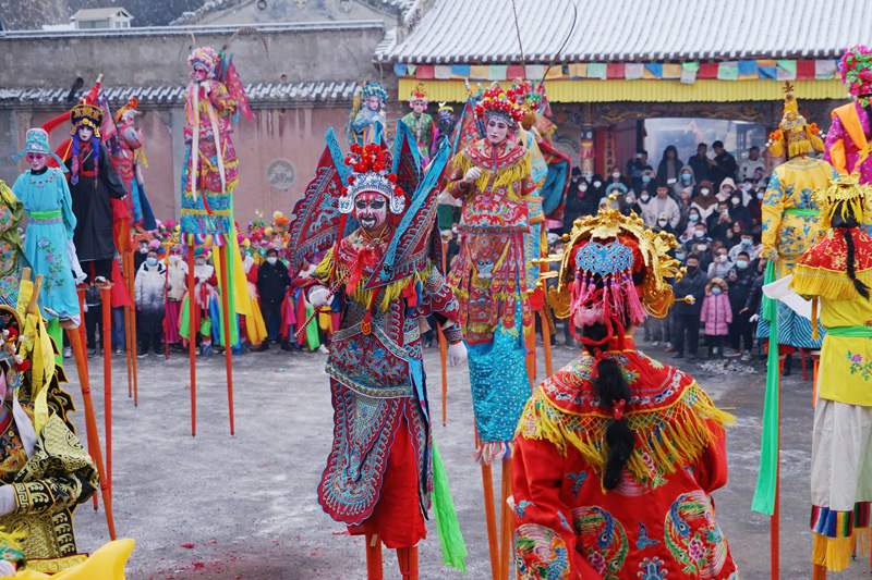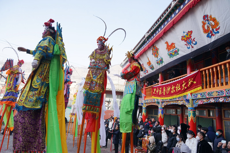1月17日,西宁市湟中区鲁沙尔镇,由当地民众组成的社火队演员们进行高跷表演。(图片来源:中新社)