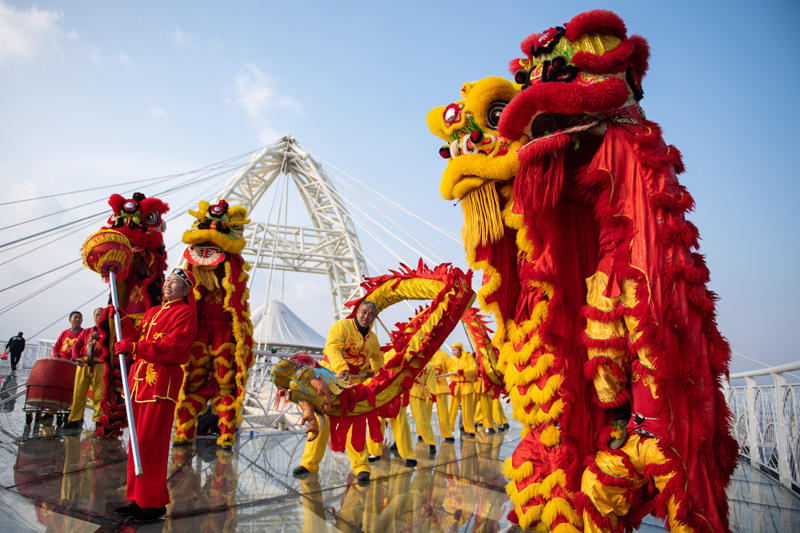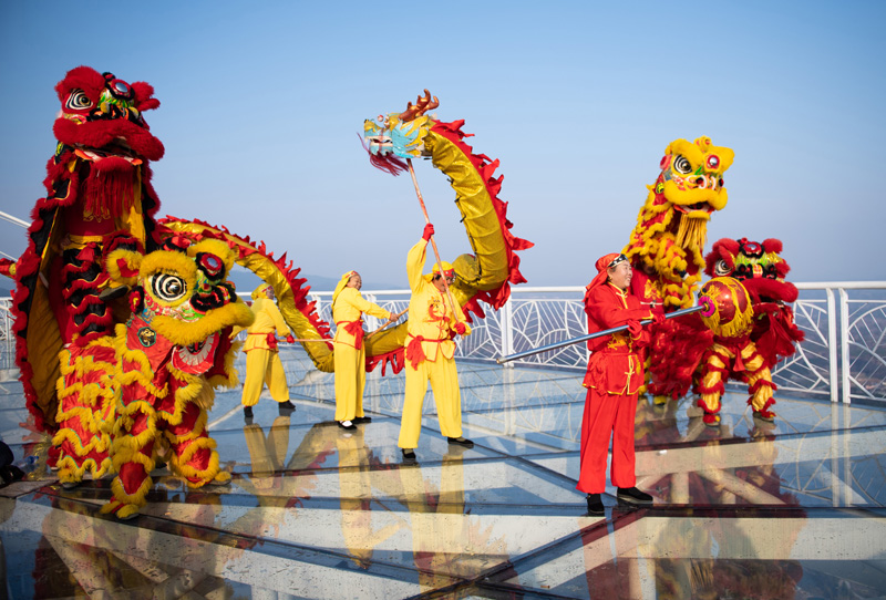 1月17日,在湖南省岳阳市平江县石牛寨国家地质公园,村民在山顶观景台舞龙舞狮。(图片来源:新华社)