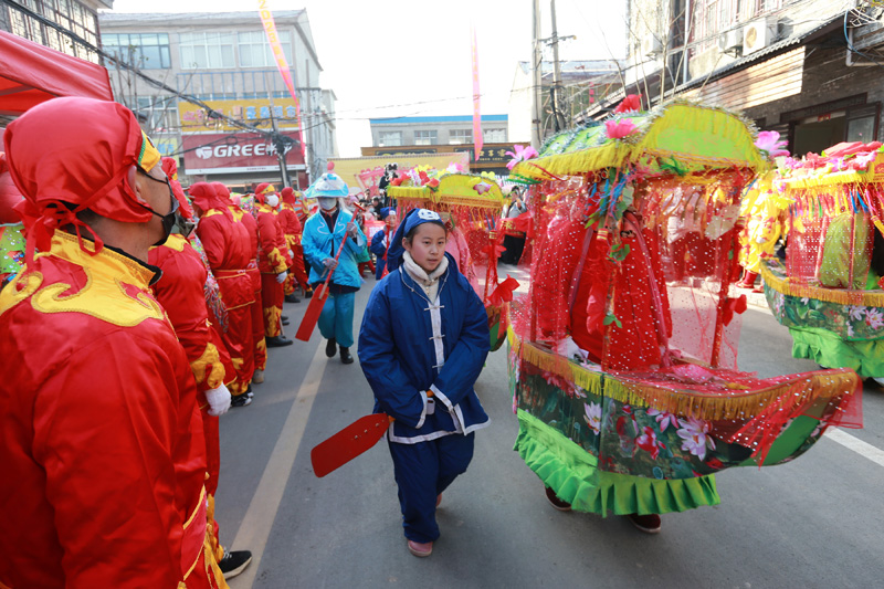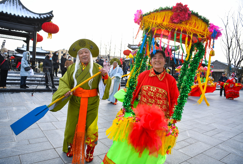 1月17日,在安徽省淮北市濉溪县千年古镇临涣镇,民俗艺人在表演划旱船。