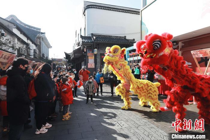 1月16日,江苏扬州“仁丰里新春民俗文化节”开幕,精彩舞狮表演助兴。(图片来源:中新网发/广陵区融媒体中心供图)