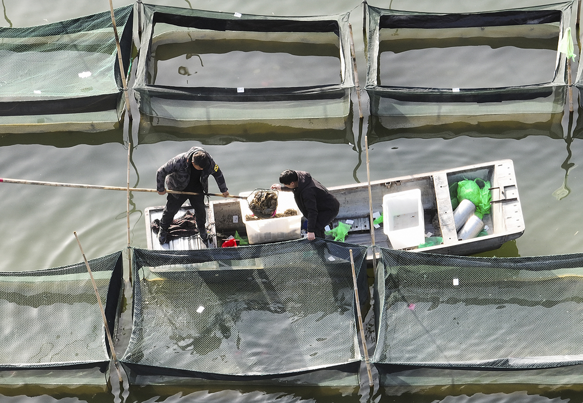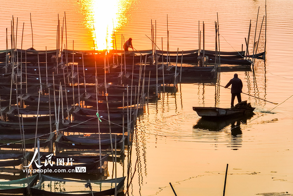 2023年1月3日,山东省济宁市微山县,渔民正在对蟹塘进行养护。近年来,依托当地丰富的水资源优势,适合水产养殖的特点,大力发展绿色生态水产养殖,促进了当地渔民增收致富。(图片来源:人民网)