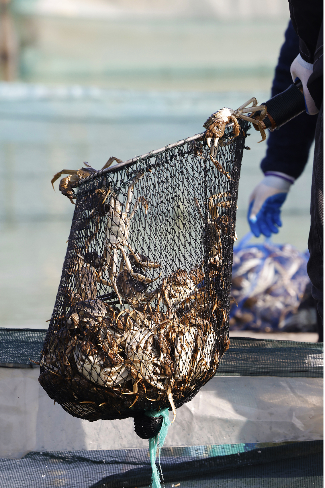 2023年1月17日,在泗洪县临淮镇螃蟹养殖基地,蟹农展示刚捕捞出水的螃蟹。(图片来源:中新社)