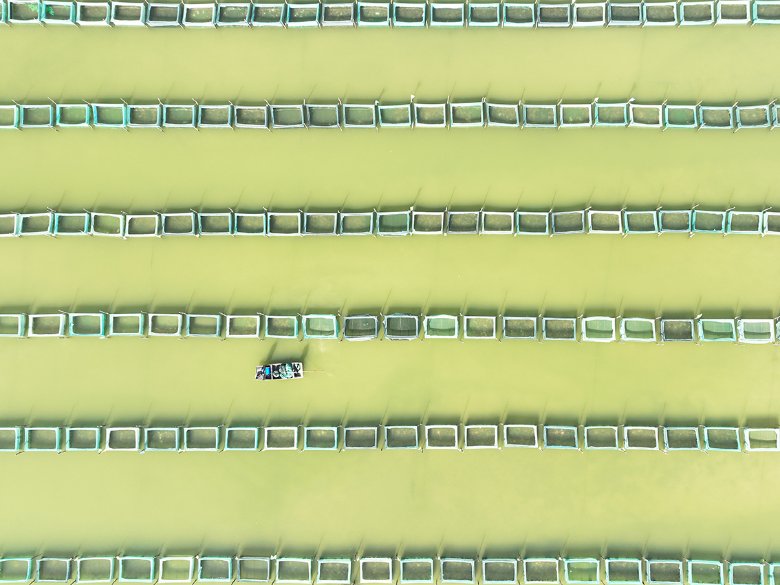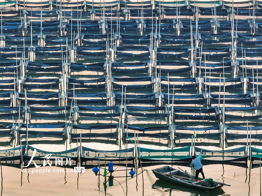 2023年1月3日,山东省济宁市微山县爱湖渔村养蟹基地网箱密布,排列有序,渔民正在对蟹塘进行养护。(图片来源:人民网)