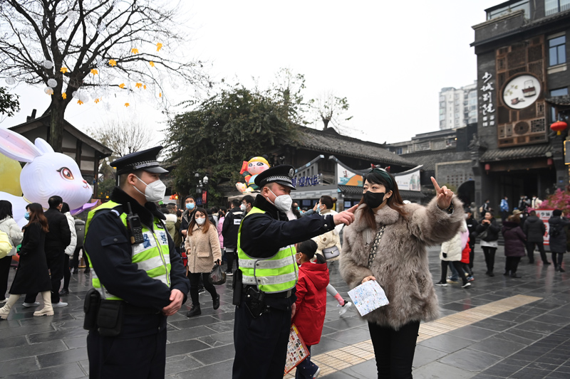 1月21日,农历除夕,在成都各个景点、交通要道、大街小巷,成都市公安局民辅警坚守各自岗位,守护城市安全。图为公安民警为游客答疑。(图片来源:中新社)